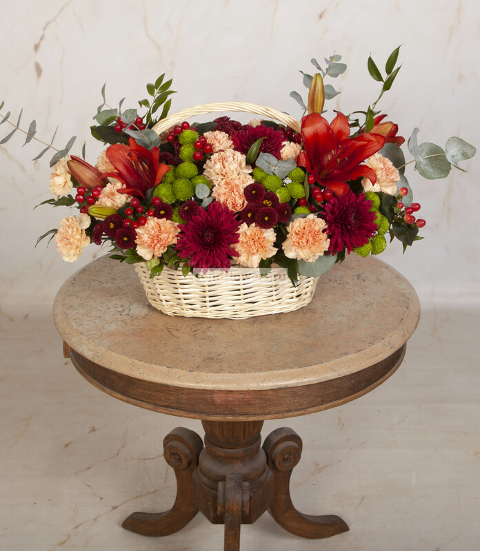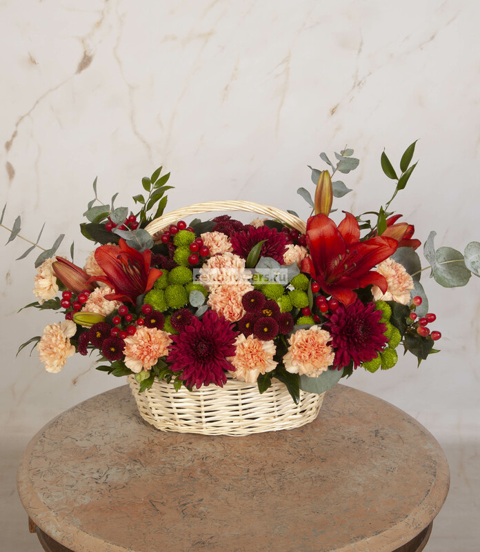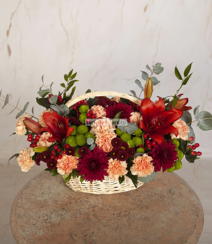 Состав: Корзина средняя (1), Гиперикум красный (10), Эвкалипт (5), Оазис кирпич (4), Рускус итальянский (3), Фисташка (7), Лилия азиатская красная (4), Хризантема Сантини зеленая (7), Хризантема Сантини красная (7), Гвоздика Novia (21), Хризантема одноголовая Barca Red (7)