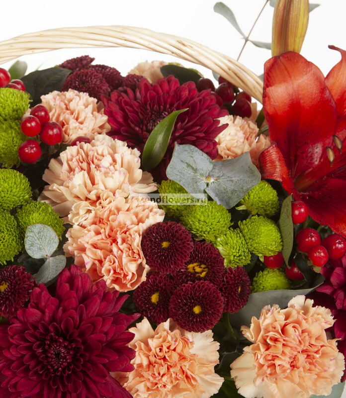 Состав: Корзина большая (1), Гиперикум красный (15), Эвкалипт (7), Оазис кирпич (6), Рускус итальянский (4), Фисташка (9), Лилия азиатская красная (6), Хризантема Сантини зеленая (9), Хризантема Сантини красная (9), Гвоздика Novia (25), Хризантема одноголовая Barca Red (9)