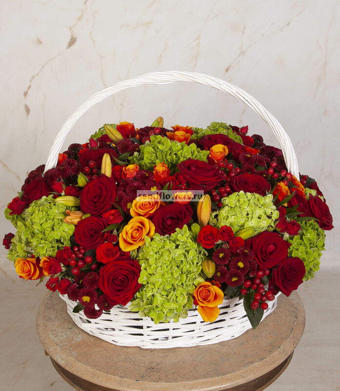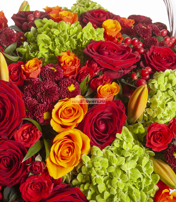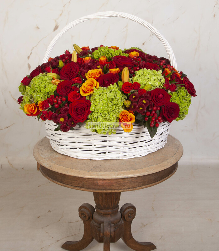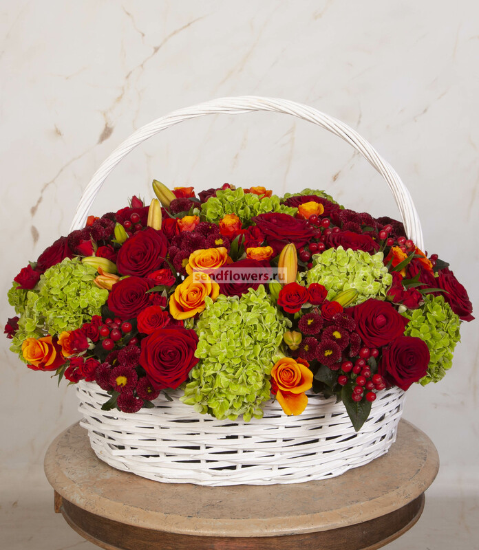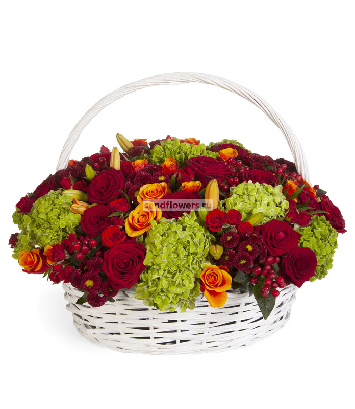 Состав: Корзина средняя (1), Гиперикум красный (10), Салал (15), Оазис кирпич (5), Роза Espana (10), Роза Гран При (15), Лилия азиатская красная (3), Роза кустовая красная (10), Хризантема Сантини красная (10), Гортензия зеленая СО (6)