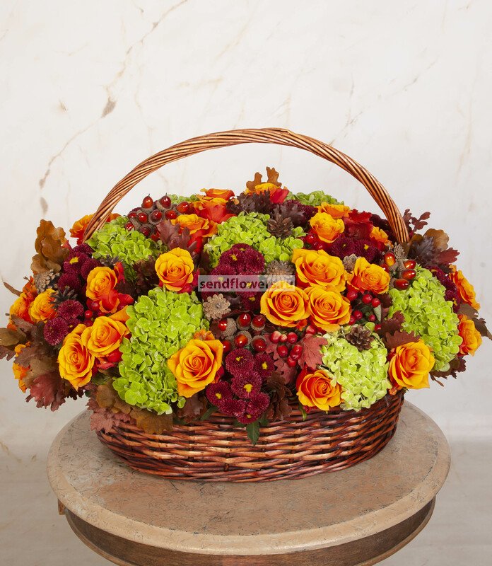 Состав: Гиперикум красный (7), Салал (15), Оазис кирпич (7), Роза Espana (45), Шишка натуральная (15), Корзина большая (1), Дуб красный (5), Хризантема Сантини красная (15), Желудь на вставке (36), Гортензия зеленая СО (9)