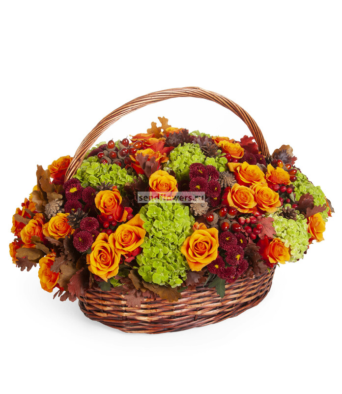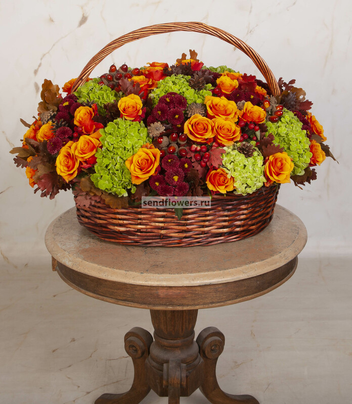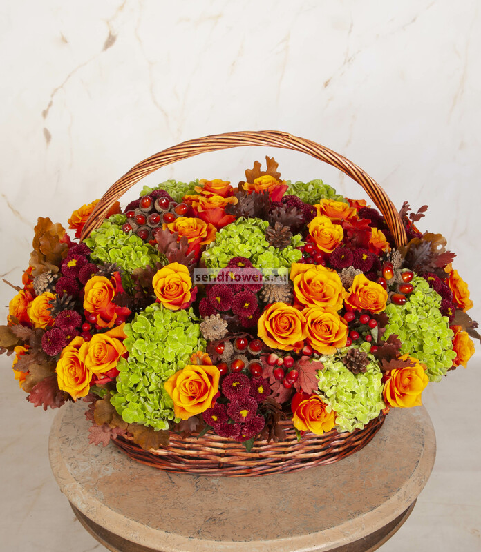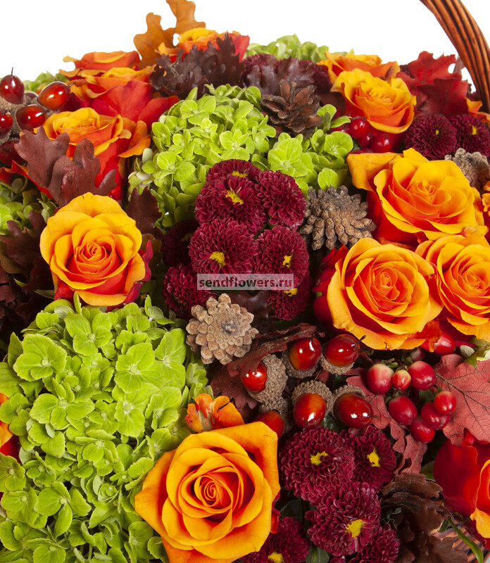 Состав: Корзина средняя (1), Гиперикум красный (5), Салал (10), Оазис кирпич (5), Роза Espana (35), Шишка натуральная (10), Дуб красный (4), Хризантема Сантини красная (10), Желудь на вставке (24), Гортензия зеленая СО (7)