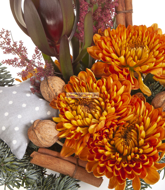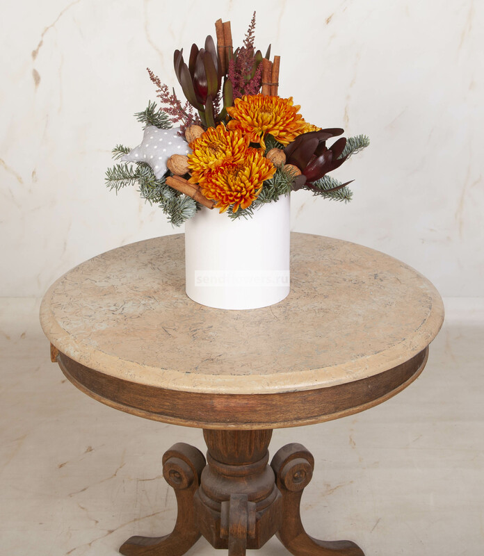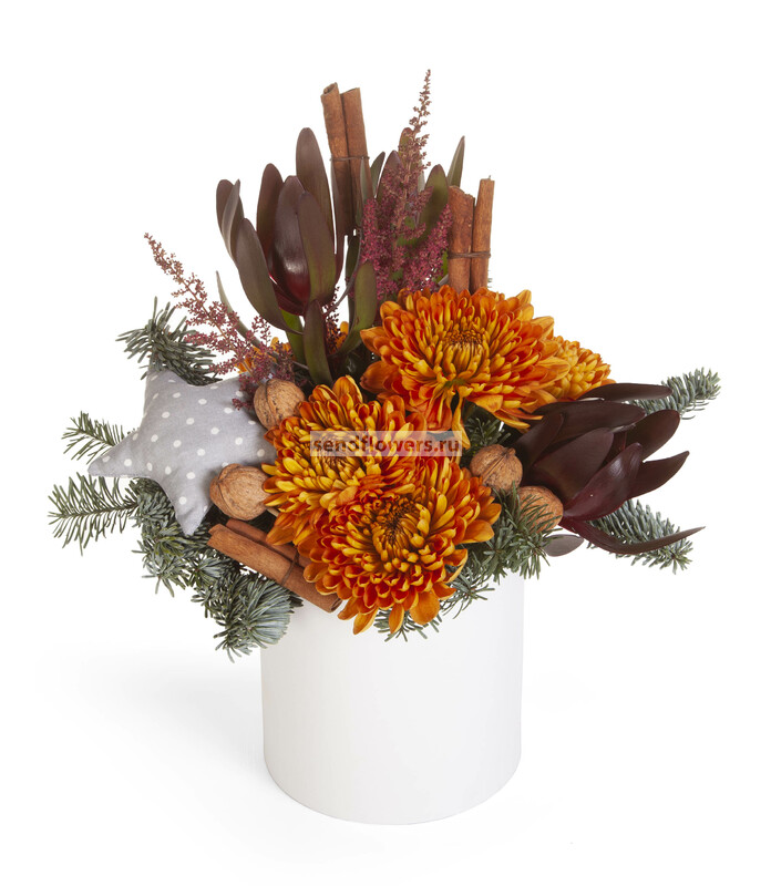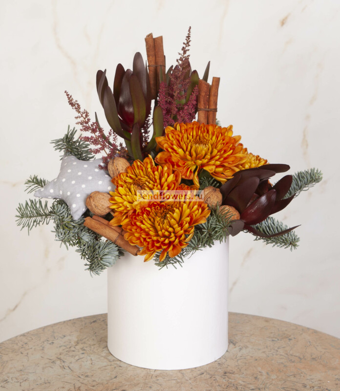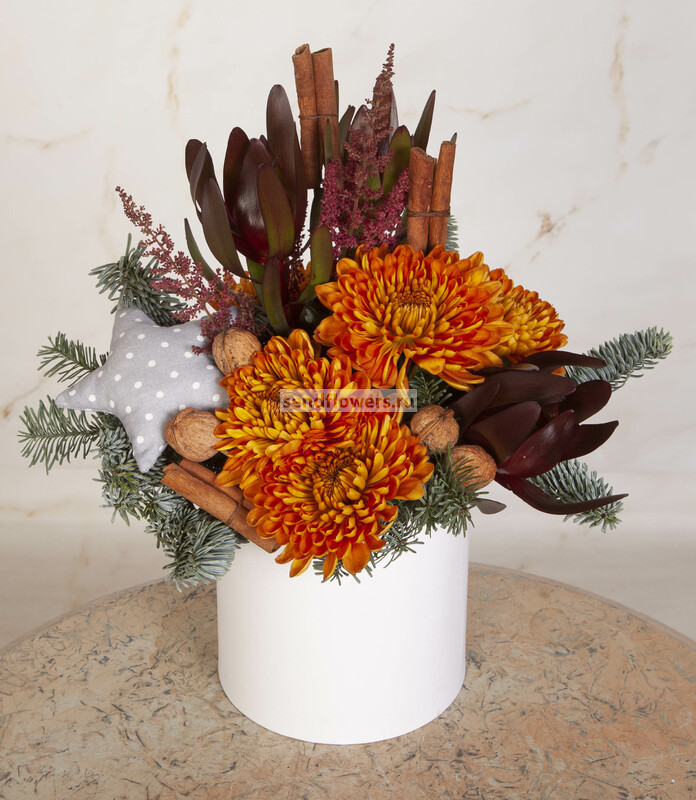 Состав: Леукадендрон Safari Sunset (3), Оазис кирпич (2), Лапник (1), Корица (6), Астильба красная (2), Грецкий орех (7), Коробка шляпная "Принт", D16xH16,5 см (1), Хризантема одноголовая Rossano Orange (5), Шитая игрушка "Звёздочка" (серая) (1)