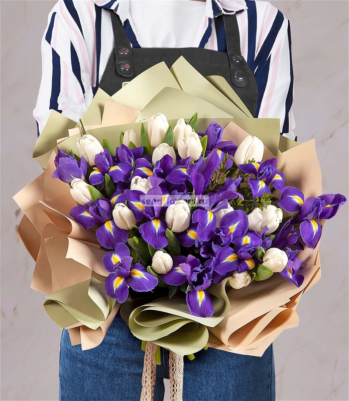Состав: Ирис синий (30), Лента натуральная (декоративная) (6), Пленка матовая (8), Тюльпан Хакун (21)