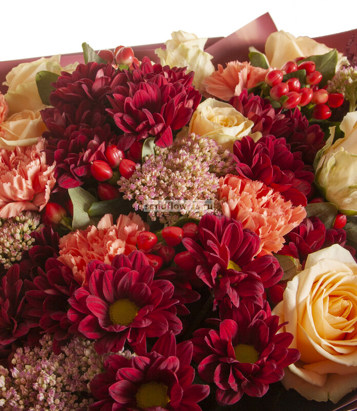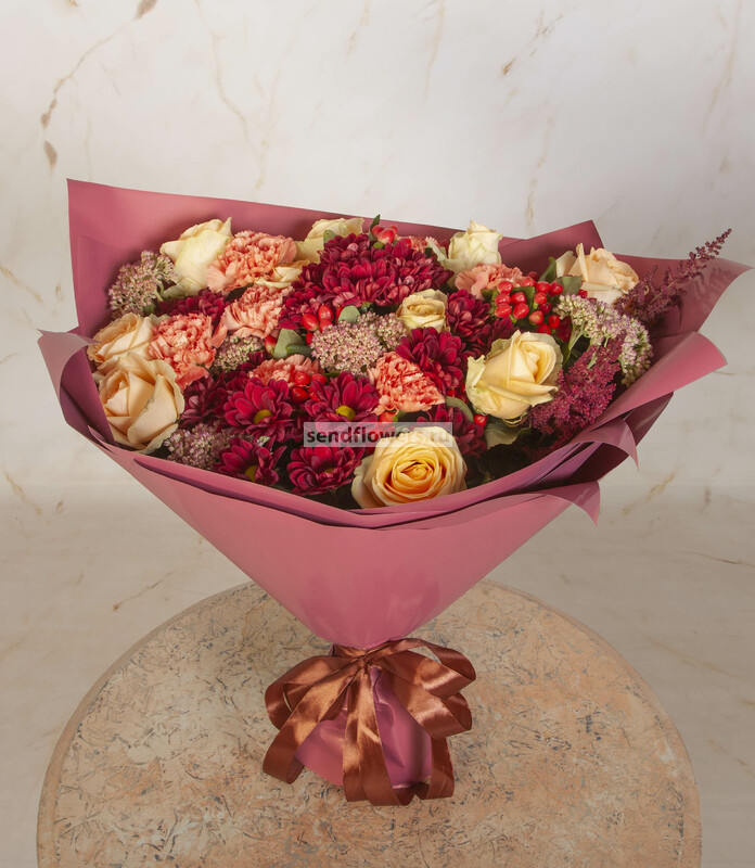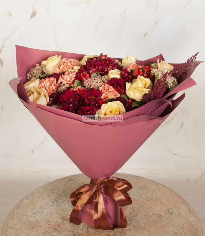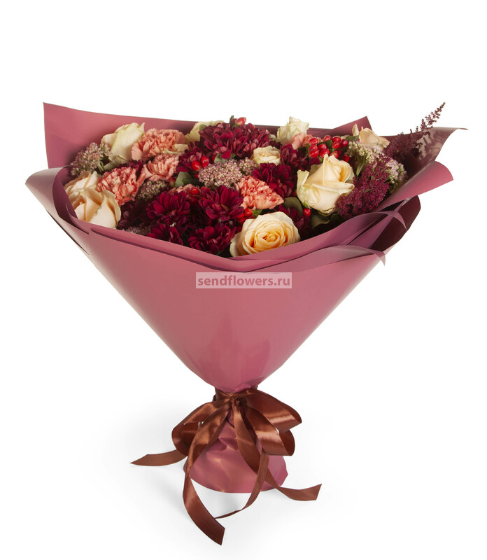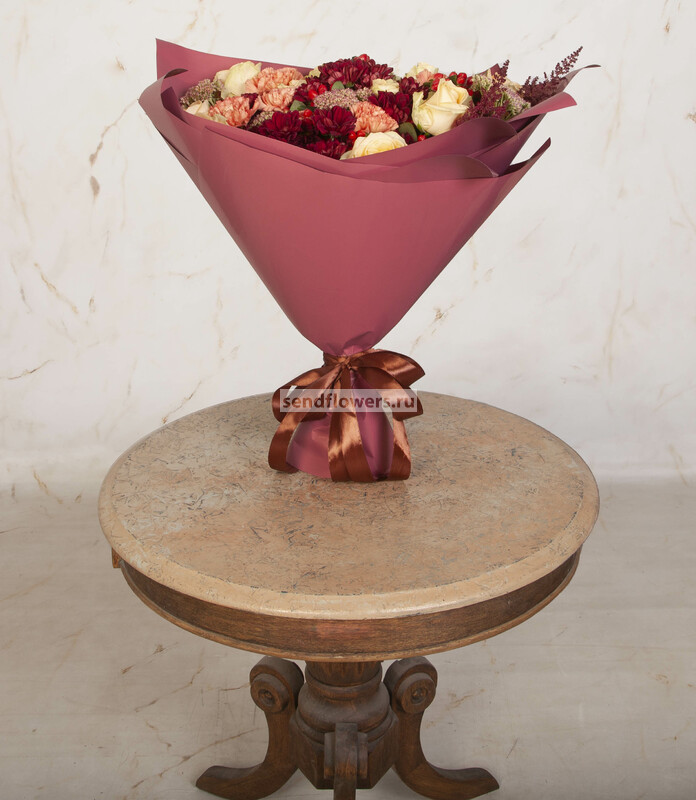 Состав: Гиперикум красный (7), Лента натуральная (5), Фисташка (7), Роза кремовая (12), Астильба красная (3), Хризантема кустовая красная (7), Пленка матовая (4), Гвоздика Crazy Horse (9), Седум зеленый (7)