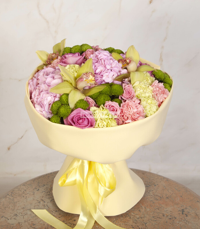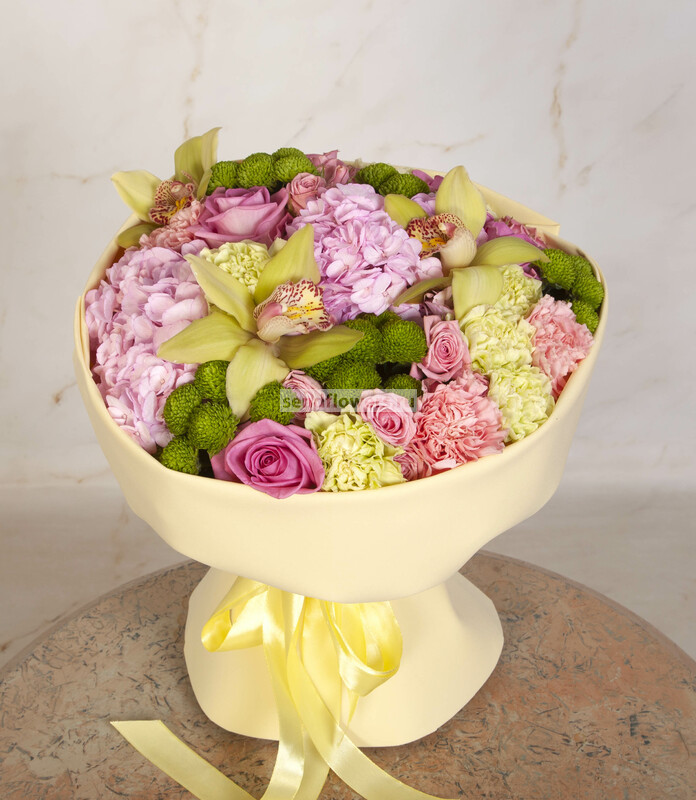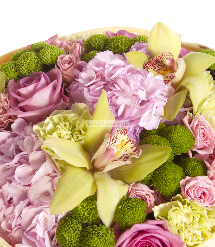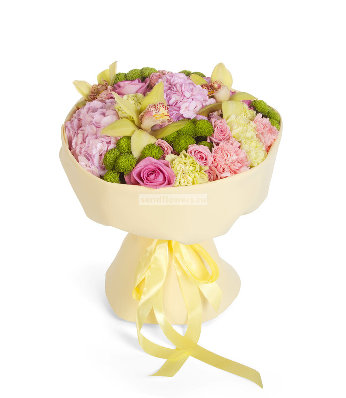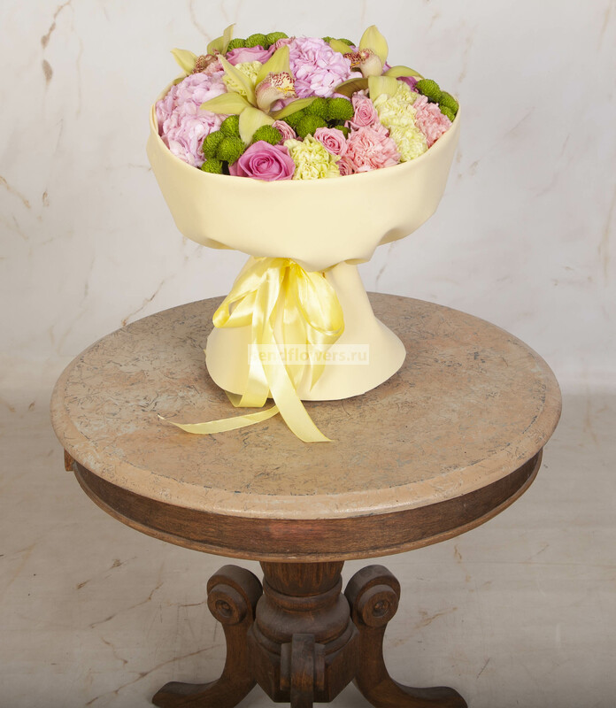 Состав: Лента натуральная (3), Фисташка (5), Гвоздика зеленая (5), Орхидея Цимбидиум зеленый (1), Роза кустовая розовая (3), Роза розовая (3), Гвоздика розовая (3), Хризантема Сантини зеленая (3), Фоамиран (2), Гортензия розовая CO (1)