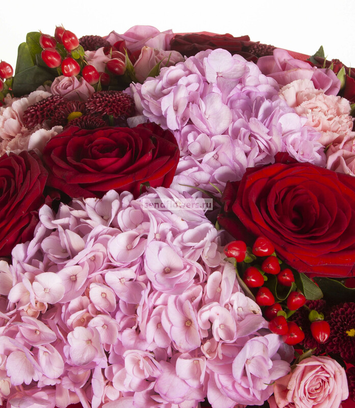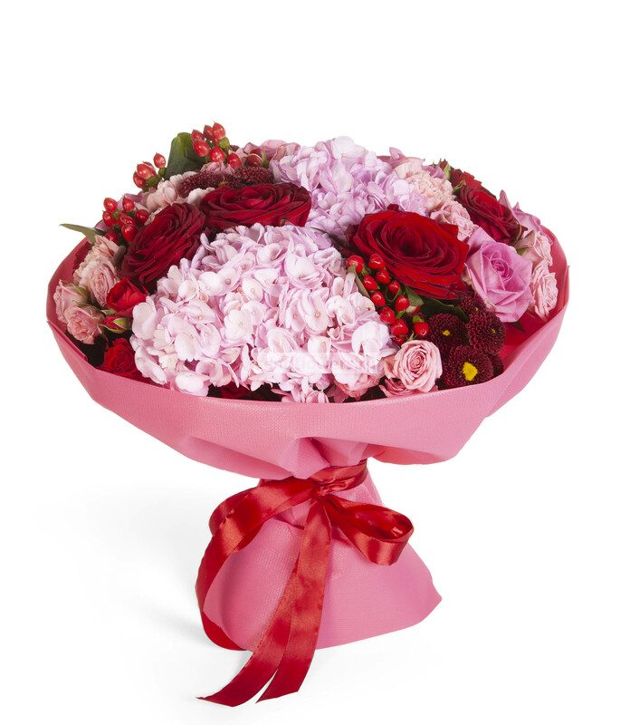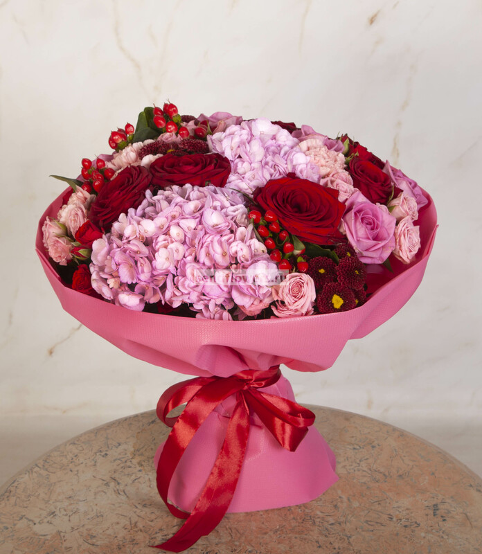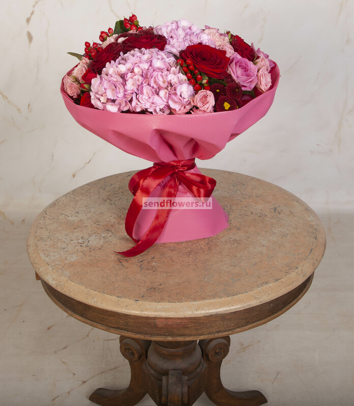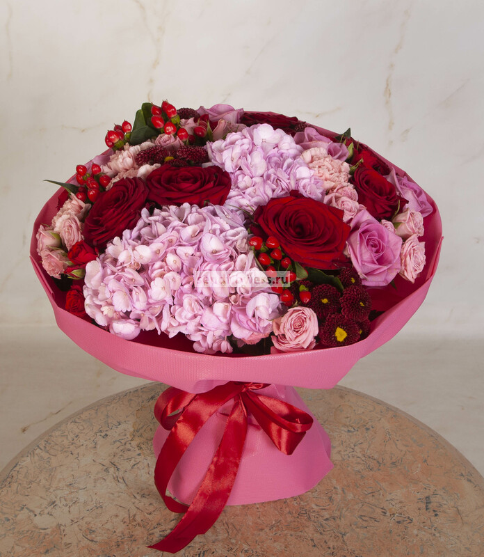 Состав: Гиперикум красный (2), Лента натуральная (3), Фисташка (5), Роза кустовая розовая (3), Роза Гран При (5), Роза розовая (3), Гвоздика розовая (3), Роза кустовая красная (2), Хризантема Сантини красная (3), Пленка матовая (2), Гортензия розовая CO (1)