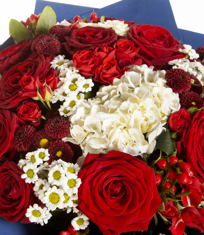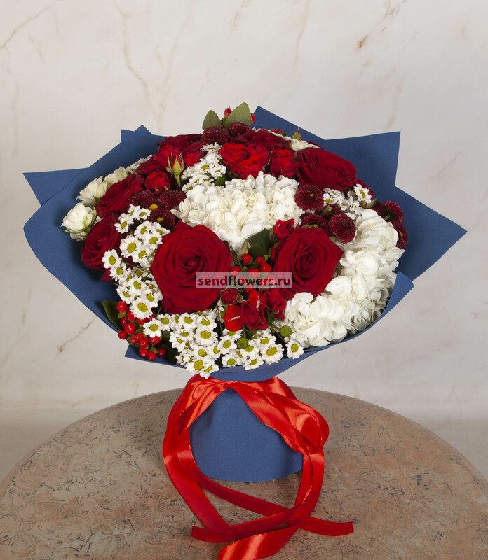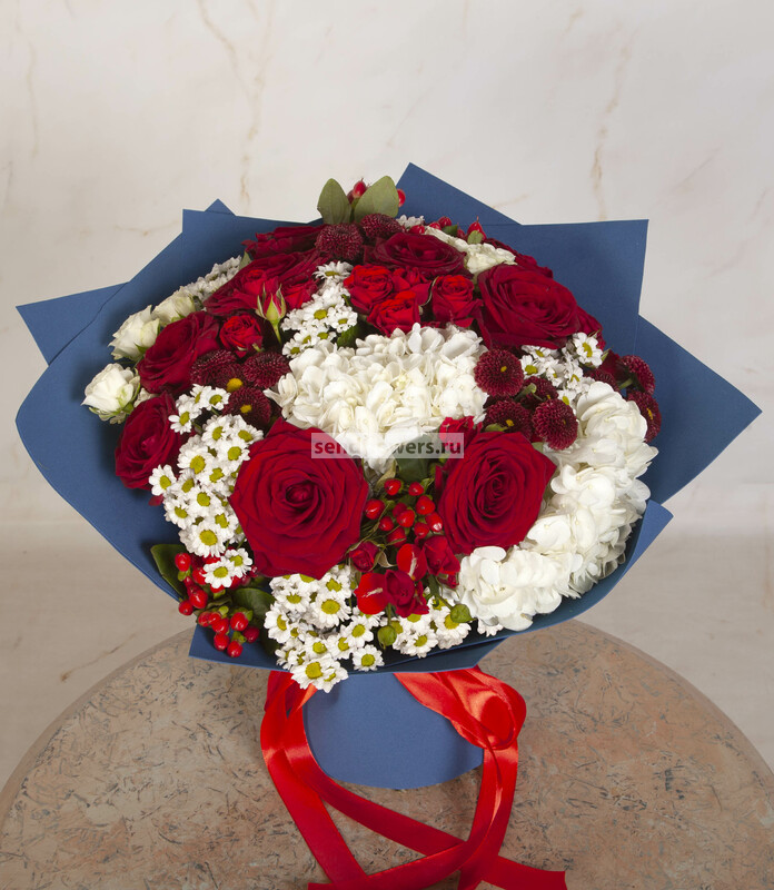 Состав: Гиперикум красный (5), Лента натуральная (4), Роза кустовая белая (4), Роза Гран При (11), Роза кустовая красная (4), Хризантема Сантини белая (6), Хризантема Сантини красная (5), Фоамиран (2), Гортензия белая CO (2)