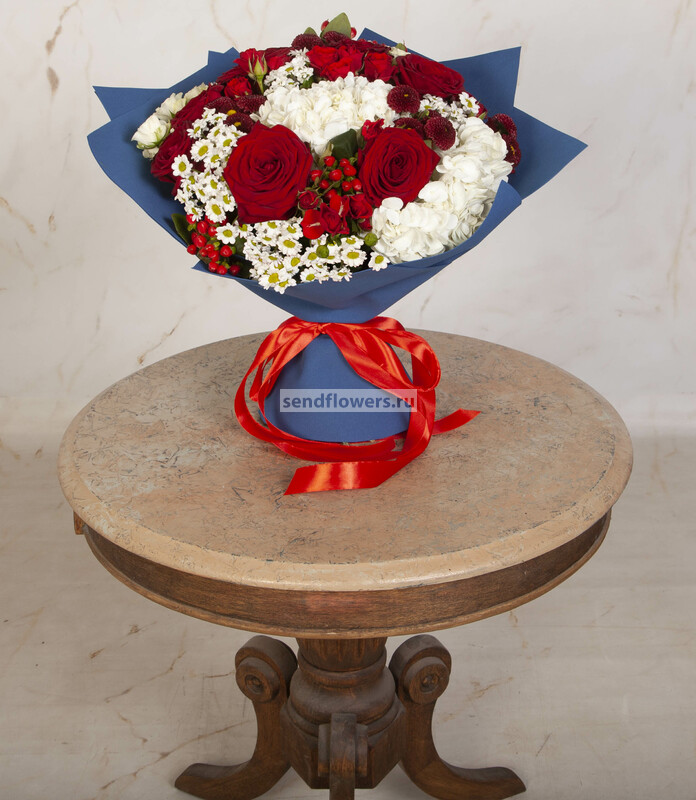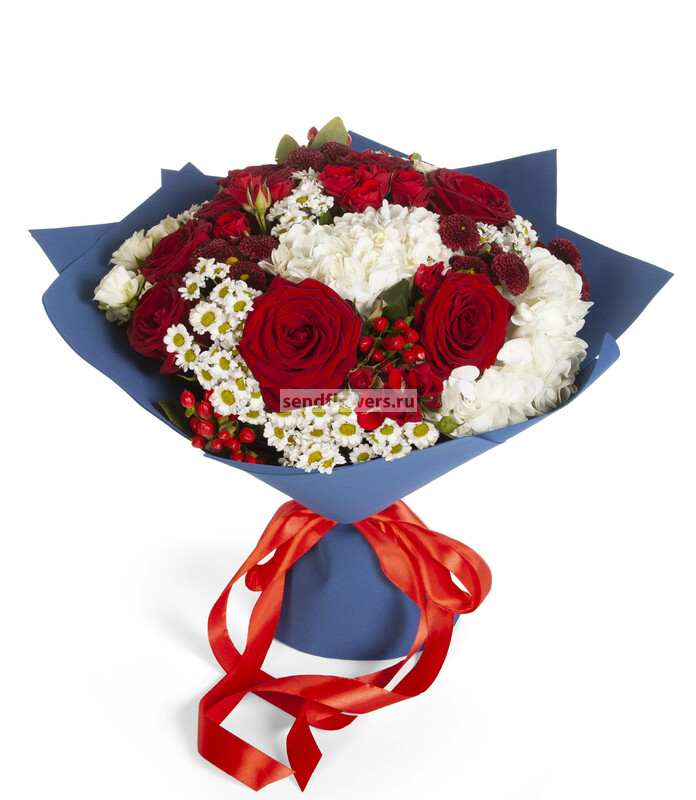Состав: Гиперикум красный (7), Лента натуральная (5), Роза кустовая белая (6), Роза Гран При (13), Роза кустовая красная (6), Хризантема Сантини белая (8), Хризантема Сантини красная (7), Фоамиран (3), Гортензия белая CO (3)